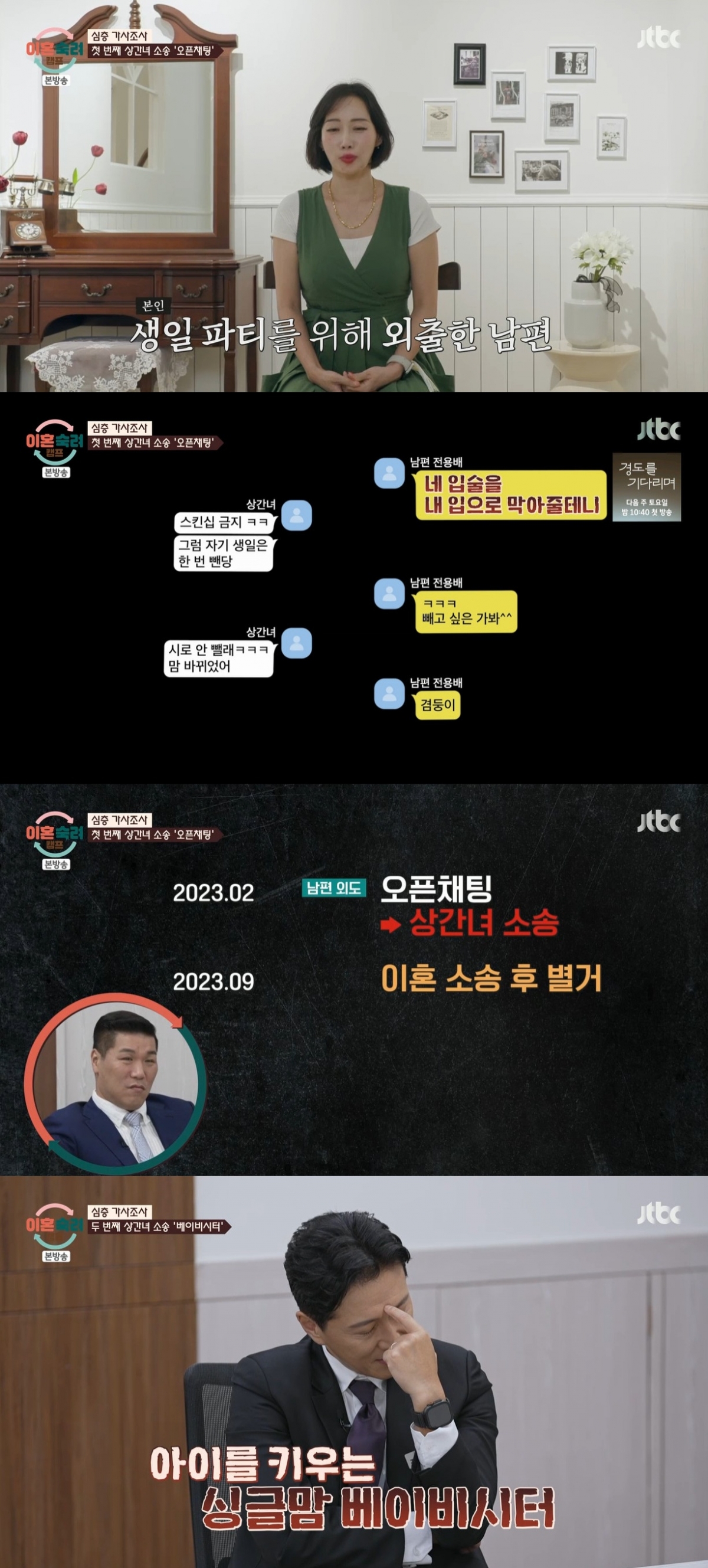 아내는 "남편이 바람났다. 친구가 생일 파티를 해준다고 해서 나갔다. 수상해서 휴대폰을 봤다. 외도 상대와는 오픈 채팅으로 만났다고 했다. 상간녀와 대화한 내용이 있었다"라며 "'우리 사이를 아내한테 말할까' 하면서 자기가 씻는 것도 보내고 그랬다"라고 말했다. 남편은 상간녀에 대해 "모임에서 만났다. 만난 건 3번 정도였다. 둘이 만난 건 두세번 정도였다. 상대도 유부녀였다. 사랑이 식어서라기보단 내 말을 들어줄 사람이 필요했다"라고 했다.