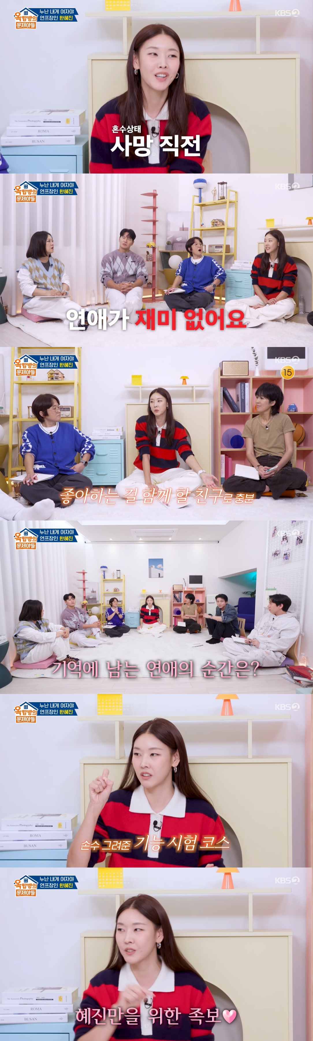 한혜진은 마지막 연애도 떠올렸다. "최소 3년 전"이라는 한혜진은 "연애 세포는 거의 사망 직전이다. 이제 연애가 재미가 없다. 그 감정이 뭔지 너무 잘 알아서 남녀와 감정을 교류하는 게 이제 재미없고 어떤 대상이 있다면 그 사람과 친구를 먹고 내가 좋아하는 걸 같이 했으면 좋겠다는 걸로 끝나는 것 같다"라고 이야기했다.