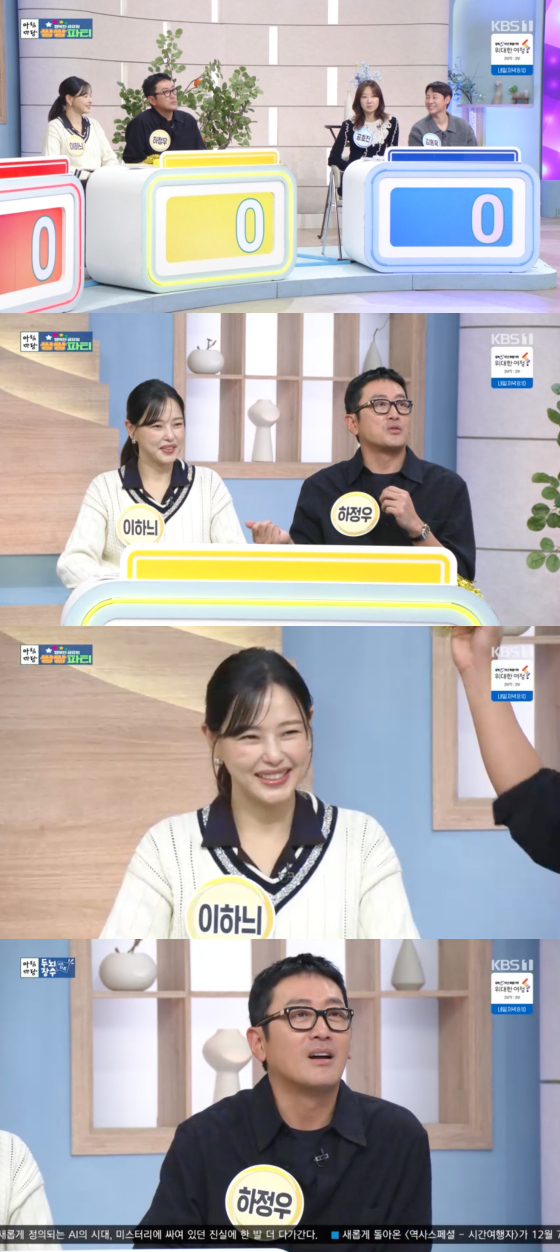 28일 오전 방송된 KBS 1TV '아침마당'의 '행복한 금요일 쌍쌍파티' 코너에는 영화 '윗집 사람들' 감독 겸 배우 하정우와 공효진, 김동욱, 이하늬가 출연했다.