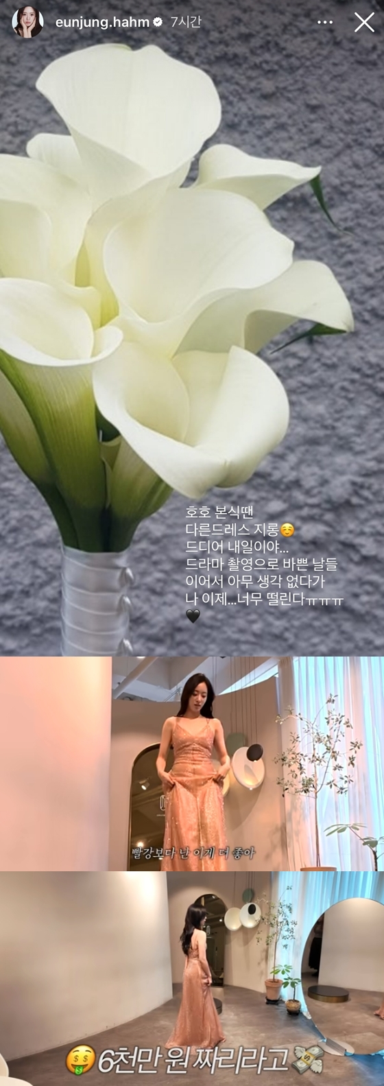 함은정은 29일 자신의 인스타그램 스토리에 "호호 본식 땐 다른 드레스지롱. 드디어 내일이야... 드라마 촬영으로 바쁜 날들 이어서 아무 생각 없다가 나 이제 너무 떨린다"라는 글과 함께 부케 사진을 게재했다.