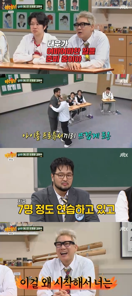 이날 이상민은 "태우가 어마어마한 일을 준비 중이다. 아이돌 제작 중이지?"라고 입을 열었다. 김태우가 고개를 끄덕이자 이상민은 자리에서 일어나 프로듀서로서 응원의 포옹을 건넸다.
