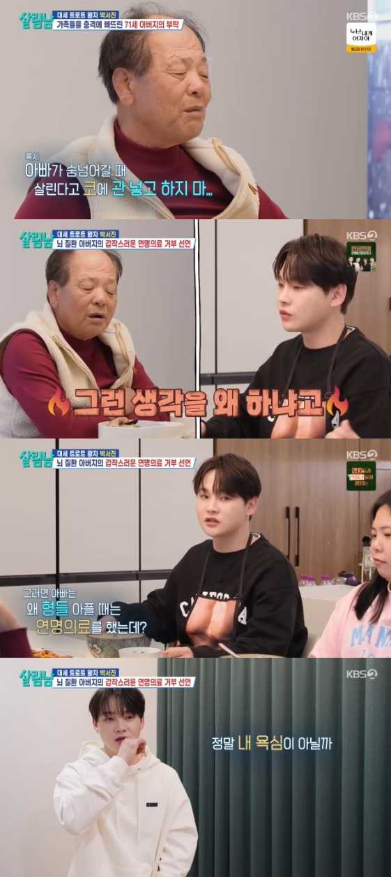 박서진 아버지는 "너도 몸이 아프고 나이 들어 봐라. 자식들이 살려보겠다고 연명 치료하는 것보다 편하게 가는 게 좋다"라고 설명했다.