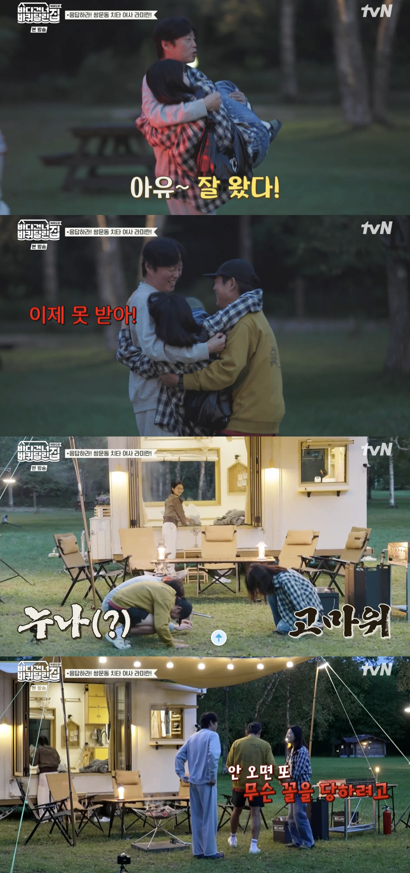이어 세 사람은 '바퀴 달린 집'에 도착했다. 라미란은 김희원을 보자마자 5년 전 '바달집' 촬영 때처럼 그의 품에 다리를 올려 공주 안기로 안겼다. 김희원은 그대로 라미란을 들어 성동일에게 건네려 했으나, 라미란은 "선배님 다친다"라며 먼저 내려와 웃음을 유발했다.