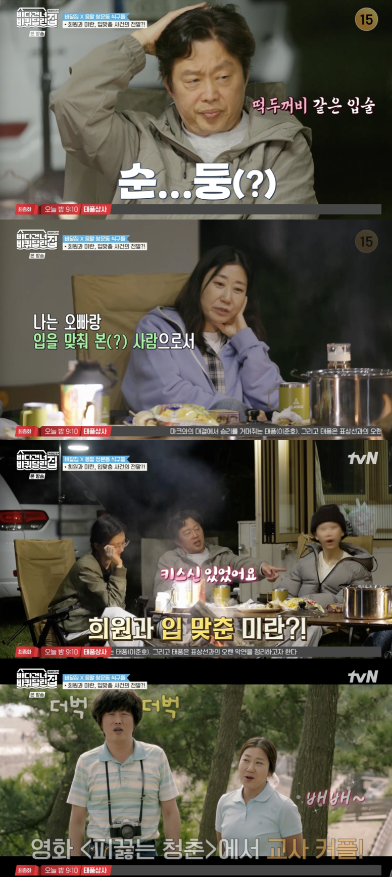 이날 저녁 식사 자리에서 류혜영은 김희원을 향해 "순한 외모다"라고 말했다. 그러자 라미란은 "난 오빠랑 입을 맞춰본 사람이다"라며 영화 '피 끓는 청춘'에서 교사 커플로 호흡을 맞추며 키스신을 찍었던 사실을 꺼냈다.