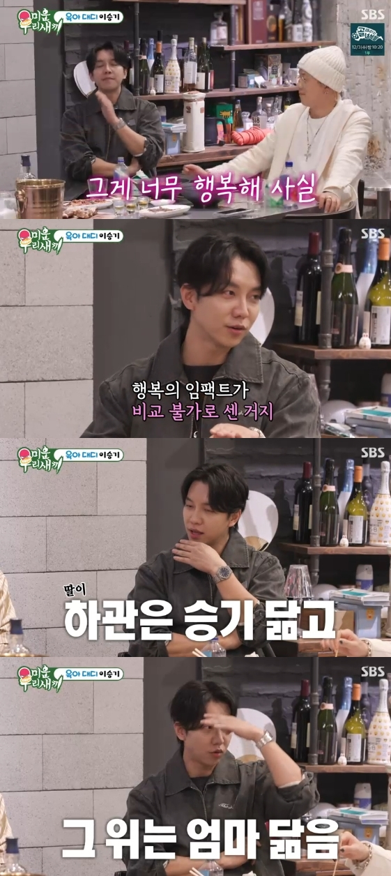 이날 이승기는 "아이는 잘 크냐"는 질문에 "너무 귀엽다. 지금 21개월인데 어린이집에 가기 시작했다. 요즘 와이프랑 같이 등·하원 시키는데 그게 너무 행복하다. 당연히 힘들고 지치는 순간이 많지만 행복의 임팩트가 비교 불가로 세다"라며 미소 지었다.