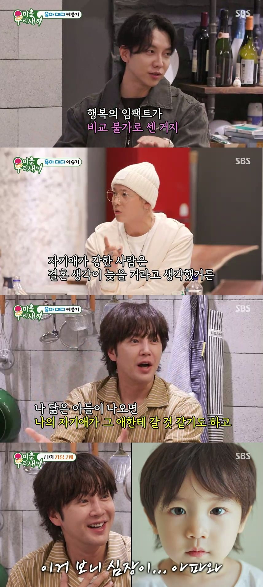 이날 방송에는 배우 장근석의 자기애 가득한 '시크릿 아지트'에서 절친 이홍기와 이승기가 방문하는 모습이 그려졌다. 이승기는 "아기는 잘 크냐"라는 질문에 21개월 된 딸과의 근황을 전하며 "와이프랑 같이 등하원 시키는데 그게 너무 행복하다"고 밝혔다. 이어 "당연히 힘들다. 그 순간을 제외하고 힘든 게 더 많다. 근데 행복의 임팩트가 비교 불가로 센 거다"고 덧붙였다.