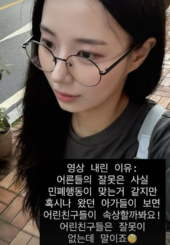 그러나 이후 해당 영상은 삭제됐다. 그는 영상을 내린 이유에 대해 "어른들의 잘못은 사실 민폐 행동이 맞는 거 같지만 혹시나 왔던 아가들이 보면 어린 친구들이 속상할까 봐 내렸다. 어린 친구들은 잘못이 없다"고 설명했다. 해당 글 역시 현재 올린 지 얼마 안 돼 지워진 상태다.