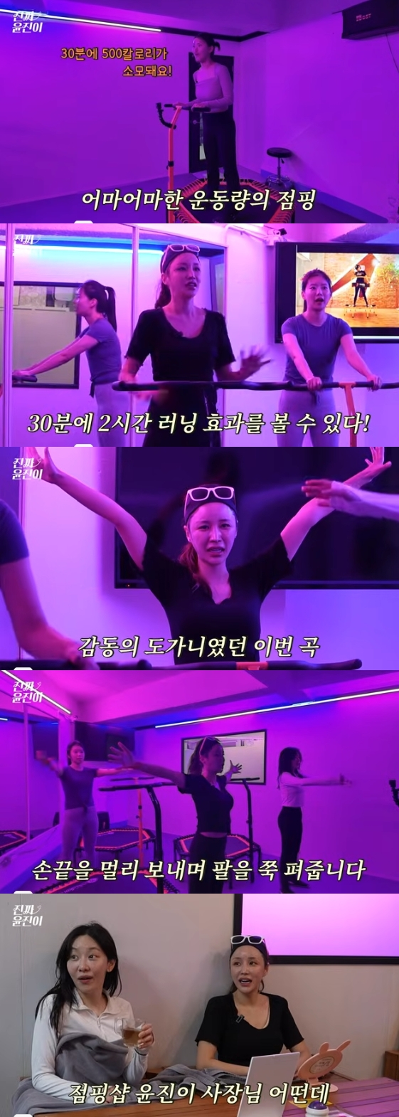 이날 윤진이는 친구들과 함께 점핑 다이어트 센터에 방문했다. 강사는 "30분에 500kcal가 소모된다. 달리기 2시간 하는 효과를 낼 수 있다"라고 설명해 시선을 모았다.