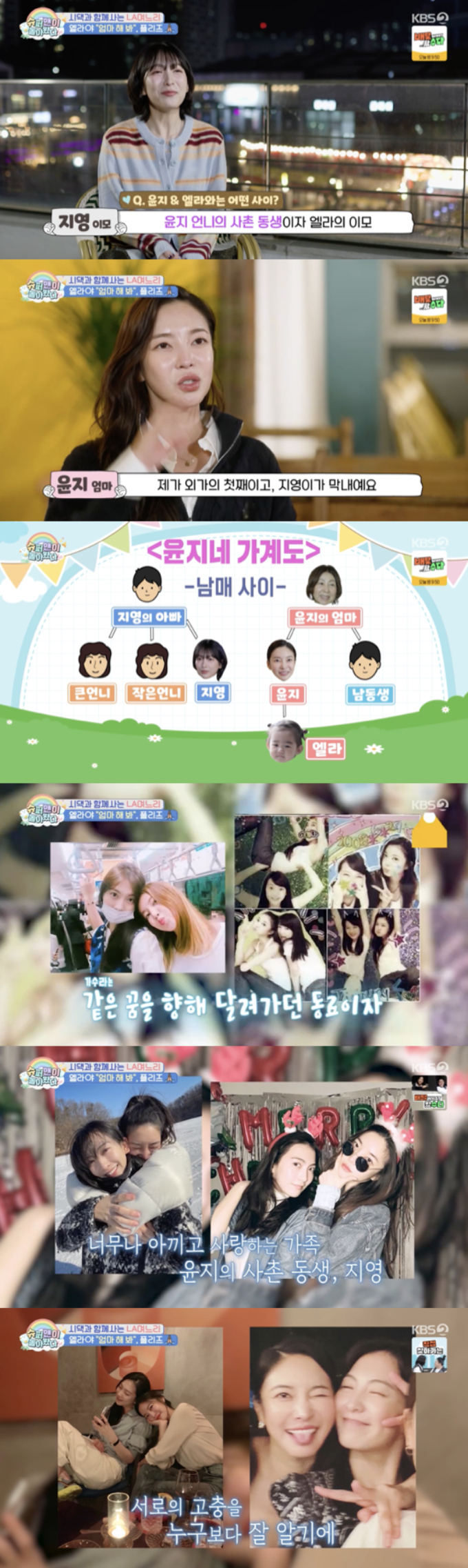그는 "전 윤지 언니의 사촌동생이자 엘라의 이모다"라고 소개했다. 김윤지는 "제가 외가의 첫째고 지영이가 막내다"며 "나이 차가 무색할 정도로 너무 좋은 친구다. 결혼하기 전에는 정말 자주 만났다. 속 얘기도 자주 하던 사랑하는 동생이다. 워낙 사이가 좋고 친하다 보니까 SOS를 요청했다"고 설명했다.