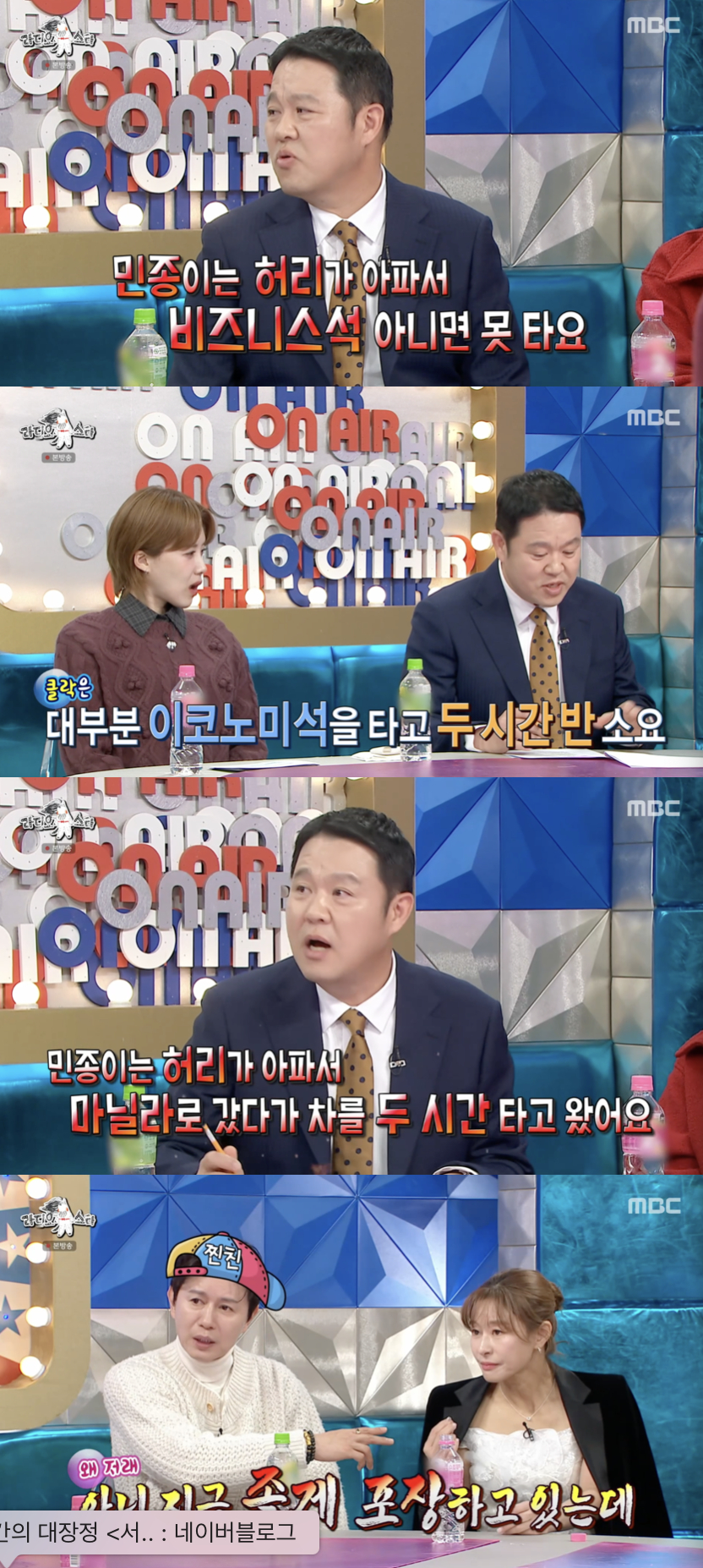 그러나 김민종은 허리를 고려해 다른 선택을 했다. 김구라는 "민종이는 허리가 아파서 마닐라로 갔다가 차를 두 시간 타고 왔다. 허리가 아파서 때려 죽어도 안 된다고 하더라"며 비즈니스석을 고집할 수밖에 없던 이유를 추측해 웃음을 자아냈다.