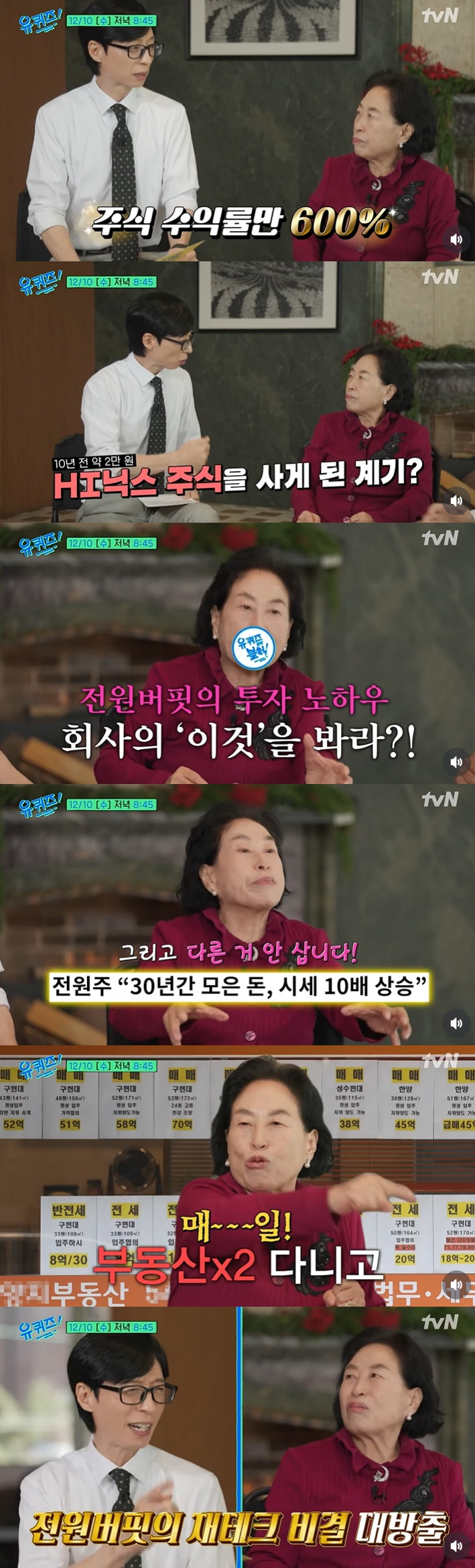 또 전원주는 "그리고 다른 거 안 산다. 금 산다"라고 밝혔다. 전원주가 30년간 모은 돈은 현 시세로 10배 상승한 것. 전원주는 "매일 부동산 다니고 옷은 다 싸구려다"라고 말했다.