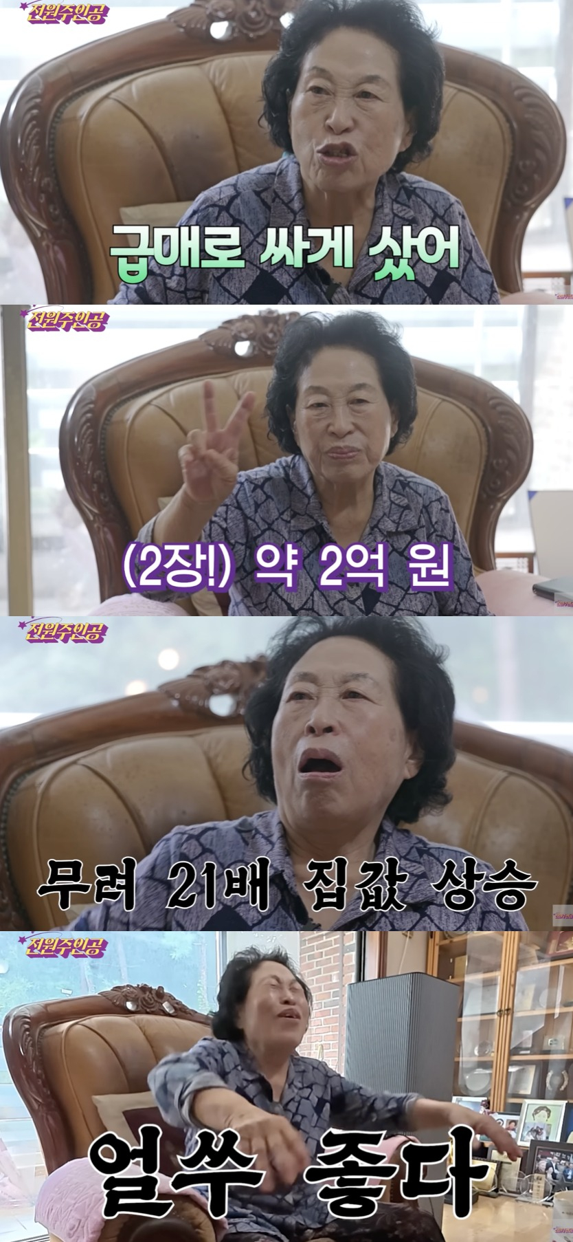 전원주는 지난달 21일 공개된 유튜브 채널 '전원주_전원주인공'을 통해 하이닉스 주식이 20배 상승하고 집값은 21배 오른 근황을 공개했다.