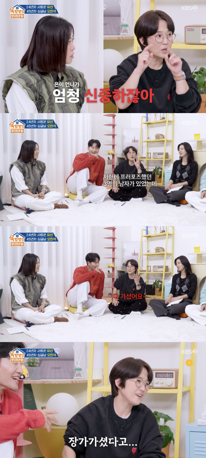이 말을 듣던 김숙은 자연스럽게 송은이를 떠올리며 "(송)은이 언니가 엄청 신중하잖아. 지금도 지켜보고 있잖아"라고 말했다. 이에 송은이는 웃으며 자신의 과거를 꺼냈다. 그는 "저한테 프러포즈 했던 3명의 남자가 있었다. 그런데 다 가셨다"고 고백했다.