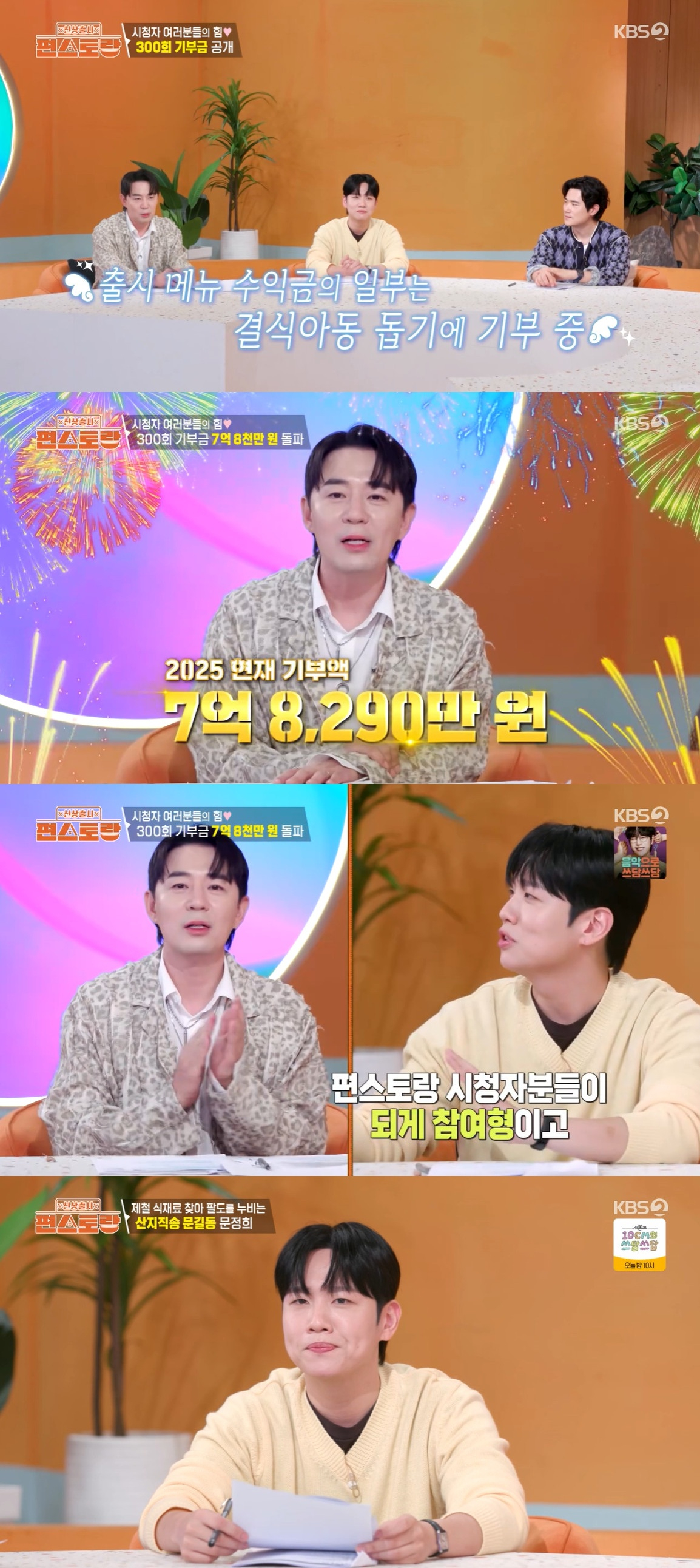 붐은 "'편스토랑'이 300회를 맞이했다"라며 "출시 메뉴 수익금 일부는 결식아동 돕기에 기부하고 있다. 현재 금액이 7억 8290만 원이다"라고 밝혔다.