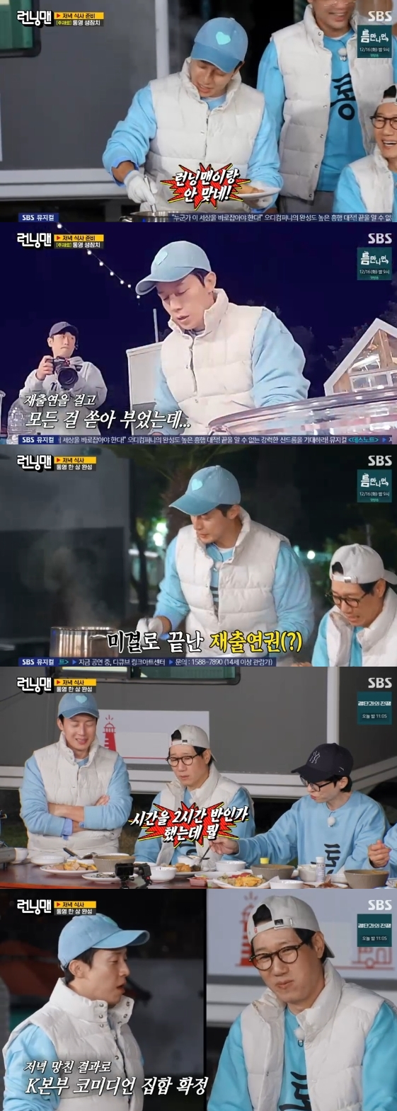 허경환은 "불 조절이 잘 안됐다. 너무 나한테 실망했다. 조금만 시간을 더 줬으면 좋았을 텐데"라고 한숨지었다. 이에 지석진은 "저녁 준비시간을 2시간 반을 줬는데 얼마나 더 주냐. 좀 싱겁다. 더 졸였어야 했다"라고 받아쳤다.