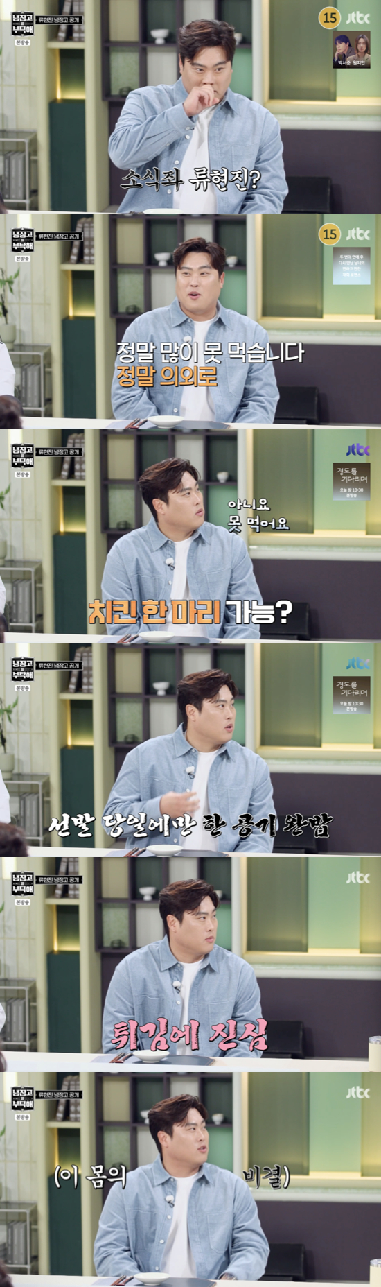 이어 그는 "밥 한 공기도 다 안 먹는다. 선발 당일에만 밥 한 공기를 먹는다. 치킨 한 마리도 다 못 먹는다"라고 밝혀 출연진을 놀라게 했다.