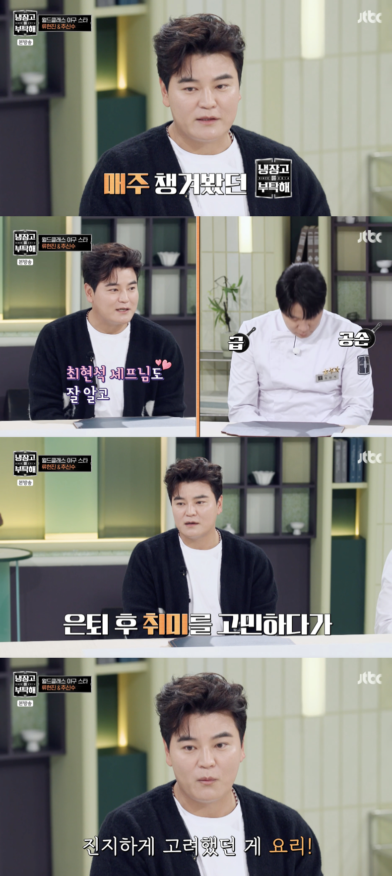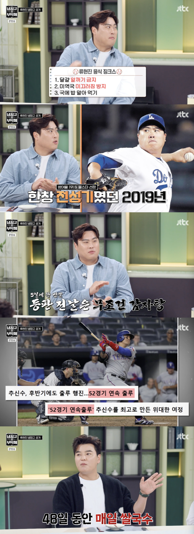 7일 방송된 JTBC 예능 프로그램 '냉장고를 부탁해 since 2014'에는 한국 야구의 상징적 투수 류현진과 메이저리그 통산 1,900억 원대 연봉을 기록한 추신수가 함께 출연했다.