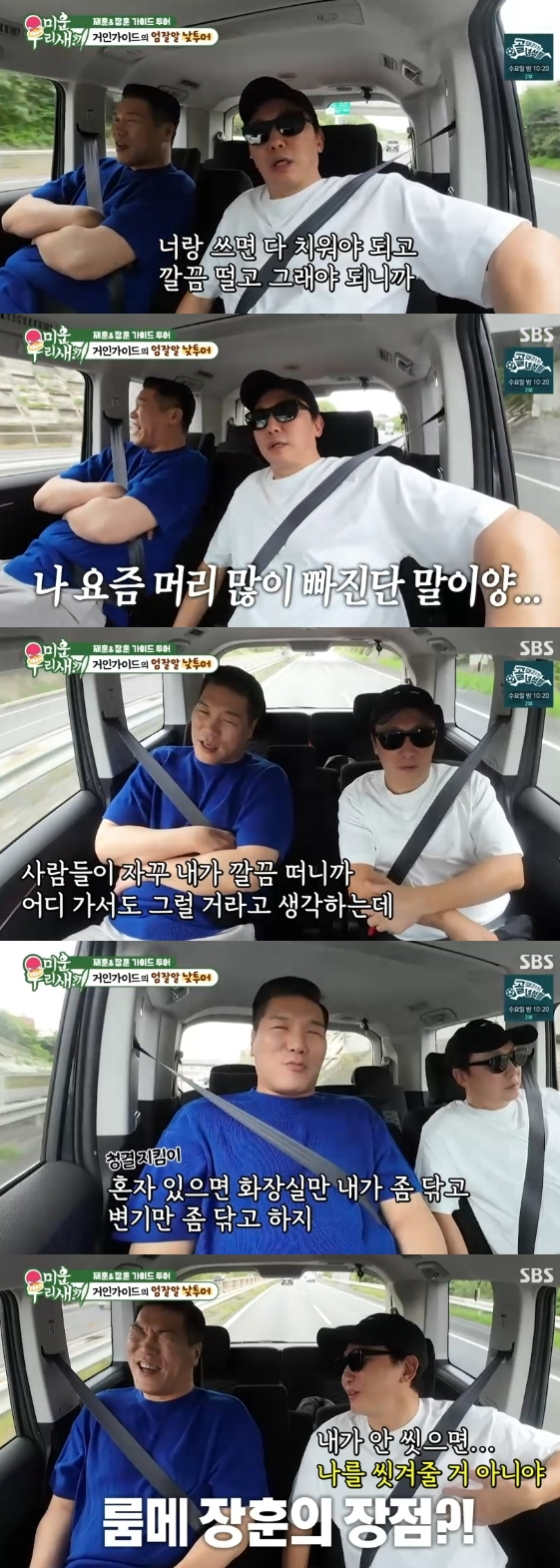 이날 서장훈은 탁재훈과 함께 '모벤져스'를 위한 오키나와 일일 가이드로 나섰다. 탁재훈은 식당으로 향하는 차 안에서 서장훈에게 한방을 쓰는 것에 대한 불만을 토로했다. 그는 서장훈의 깔끔한 면모를 언급하며 "너랑 같이 쓰면 다 치워야 하고 깔끔 떨고 그래야 하지 않나. 나 요즘 머리카락도 많이 빠진다"라고 호소했다.
