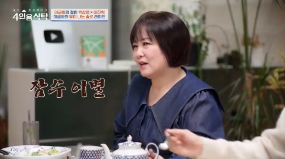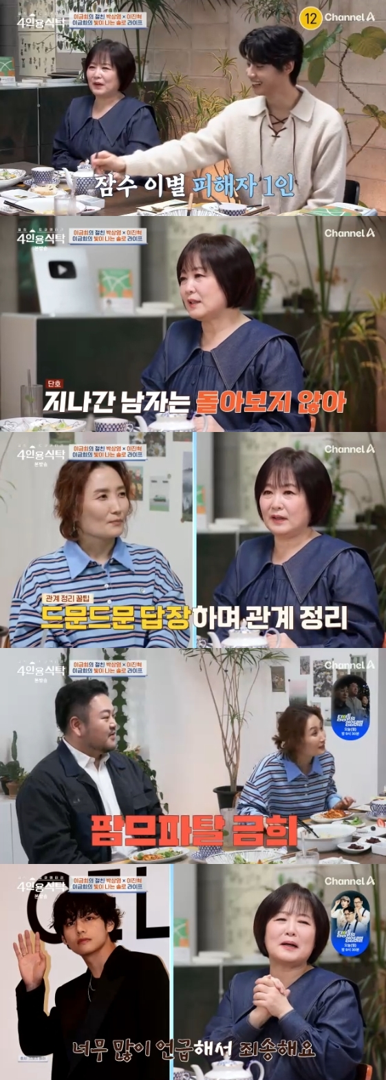 8일 방송된 채널A 예능 프로그램 '절친 도큐멘터리 4인용식탁'에는 아나운서 이금희가 절친인 박상영 작가, 가수 겸 배우 이진혁을 초대해 진솔한 대화를 나눴다.