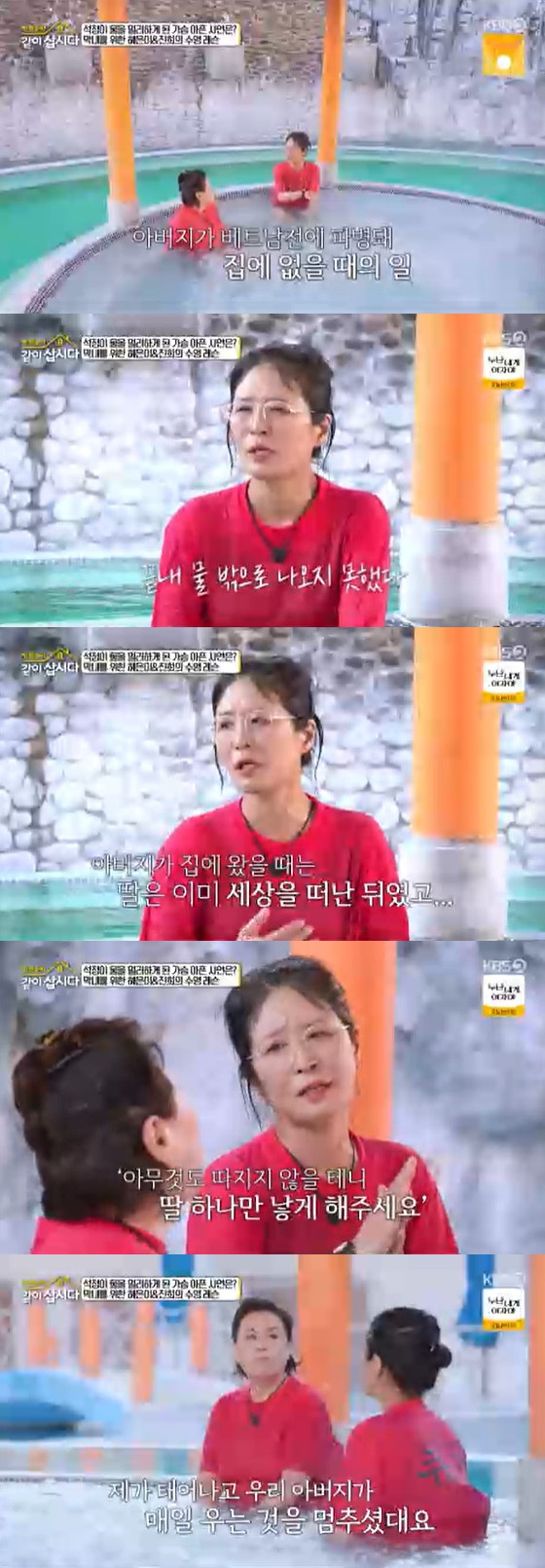 이날 황석정은 "나는 수영을 못한다. 우리 집이 다 물 근처에도 안 간다. 언니가 있었다. 그런데 우리 아버지가 베트남전에 파병됐을 때, 언니가 어린 나이에 집 앞 물가서 들어갔다가 못 나왔다. 제가 태어나기도 전에 일이다. 아버지가 집에 돌아왔는데 딸이 없으니까, 계속 울기만 하고 술만 드셨다고 한다"라고 떠올렸다.