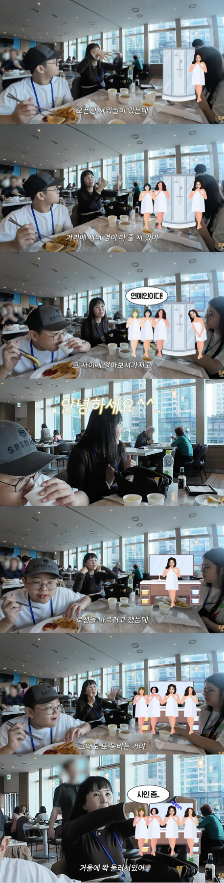 그는 "오픈형 샤워실이 있었는데, 사람들이 빨개벗고 3~4명씩 줄 서 있었다"라며 "그 사이에서 저를 알아보신 분이 있어 인사를 드렸다"고 당시 상황을 설명했다.