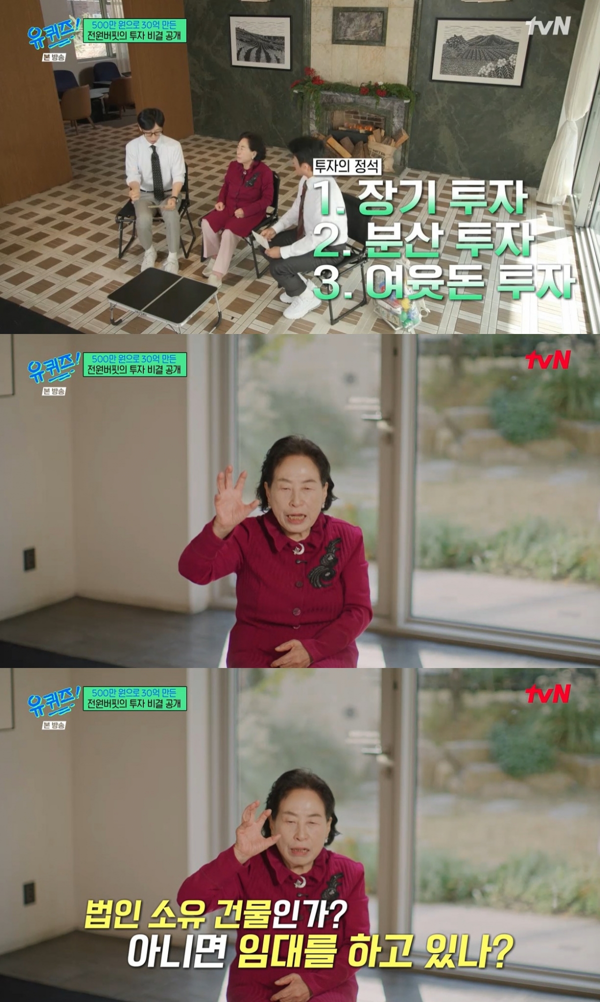 전원주는 1987년 500만 원으로 시작한 주식을 30억원으로 불려 이목을 끌었다. 현재 주식 수익률 600%라고. 그는 "회사가 단단해야 한다. 회사를 책임지는 사람의 얼굴을 봐야 한다. 주식을 소개해준 사람의 얼굴을 봐야 한다. 순하고 착하고 바르게 사는 사람을 찾아야 한다"라고 했다.