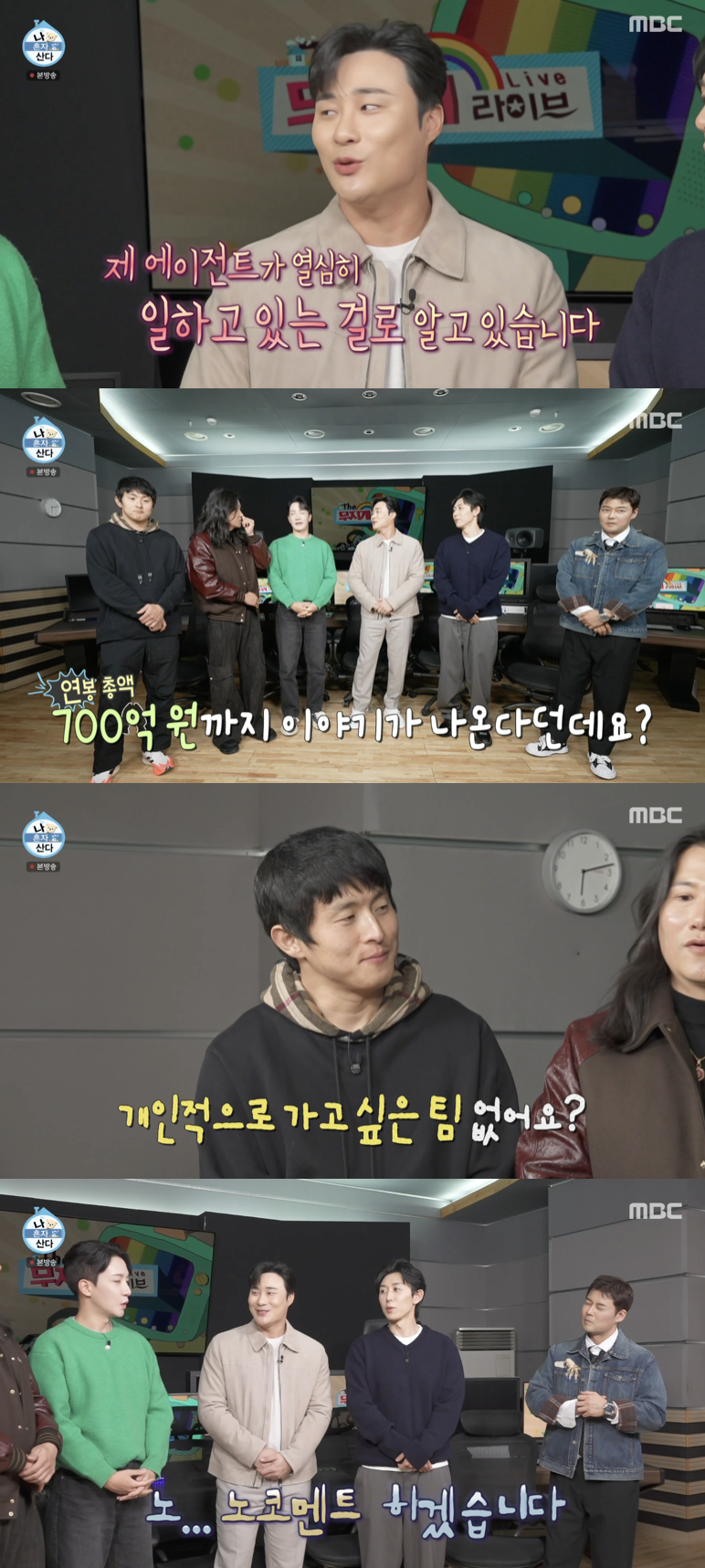 이날 무지개 회원들은 김하성이 FA 자격으로 시장에 나온 것을 언급하며 "연봉 700억 얘기까지 나오더라"라고 말했다. 전현무가 "전 구단이 다 가능성 있는 거 아니냐"라고 묻자, 김하성은 "제 에이전트가 열심히 일하는 걸로 안다"라며 에둘러 답했다.