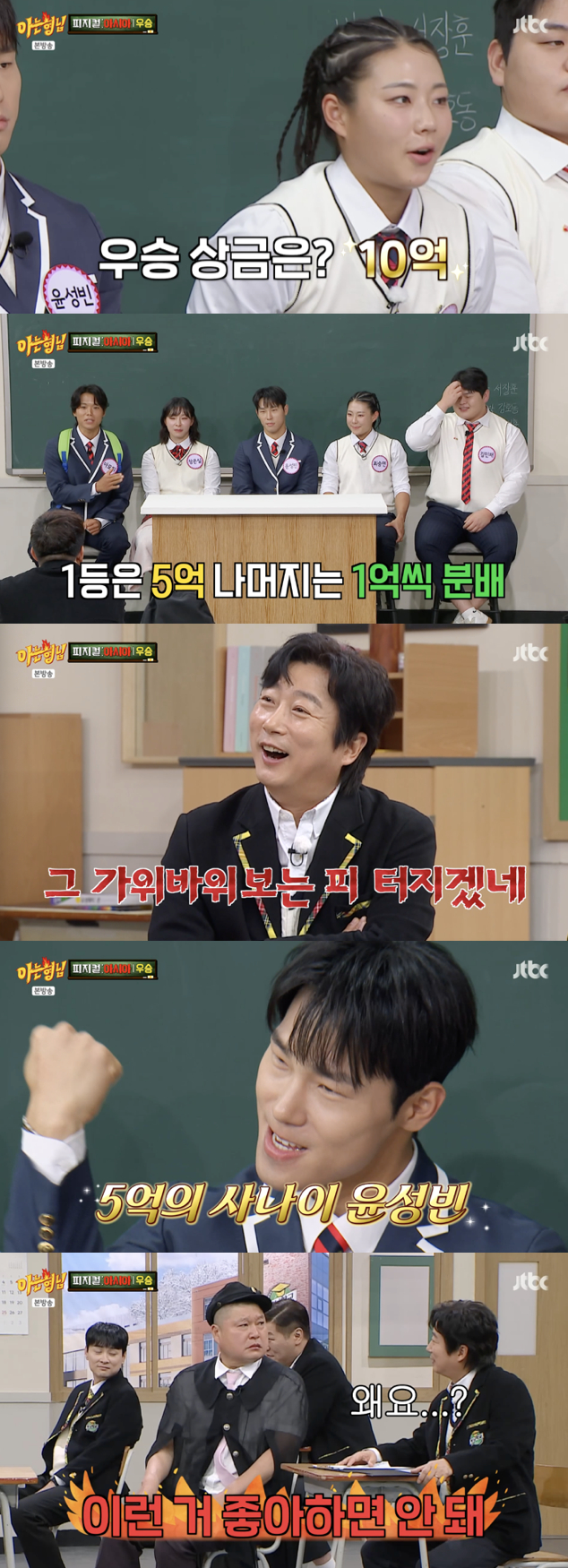 한편 이수근은 "지금은 어차피 의미 없으니까 즉석에서 가위바위보를 해보자"며 상황극을 제안했고, 실제로 진행된 가위바위보에서는 윤성빈이 승리해 눈길을 끌었다. 마치 실제였다면 윤성빈이 5억 원을 가져가는 그림이 연출된 것.