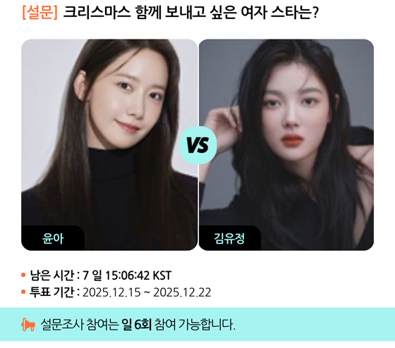 모바일 아티스트 종합 콘텐츠 앱 스타폴(STARPOLL)은 15일부터 오는 22일까지 '크리스마스 함께 보내고 싶은 여자 스타는?'이라는 주제로 설문 조사를 진행한다.