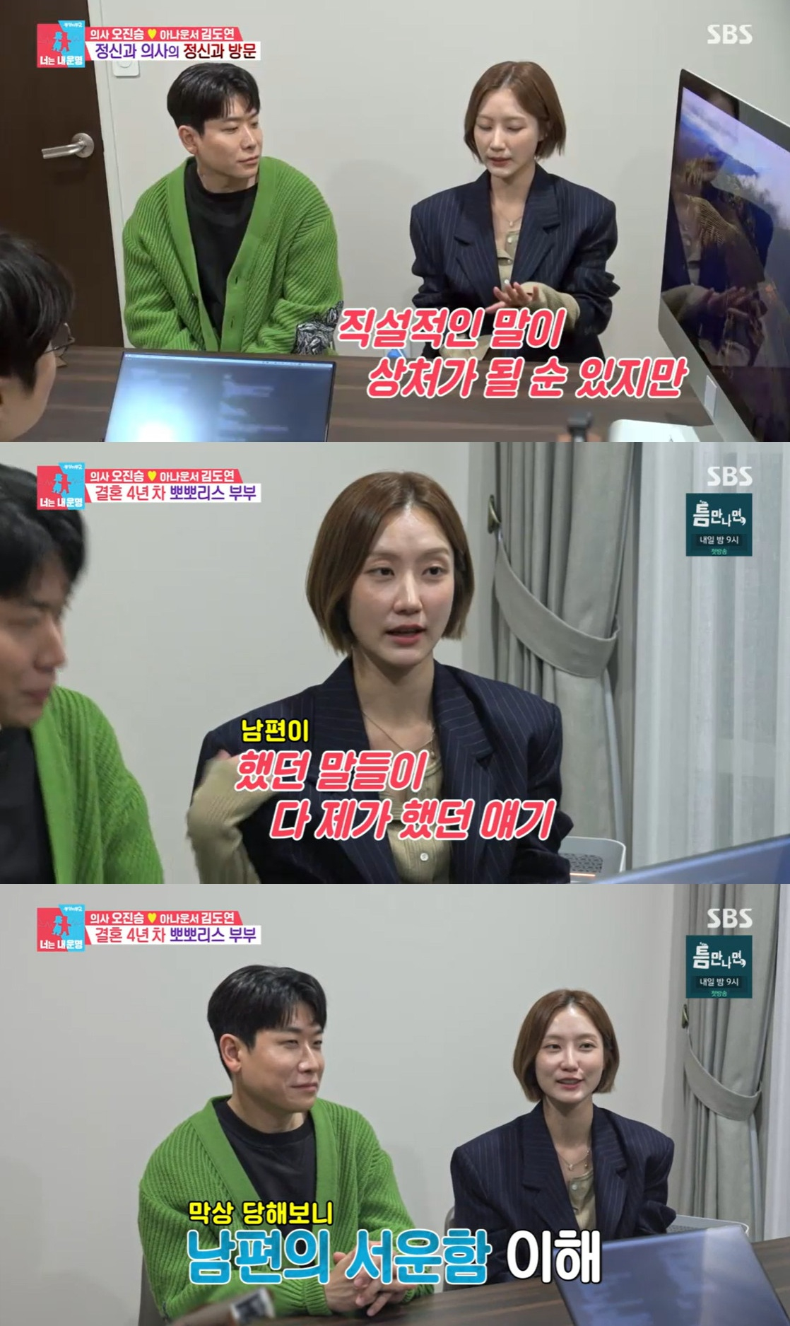 오진승, 김도연 부부가 정신과를 방문했다. 오진승은 "부부 관계이기 때문에 혼자만 진단하는 게 어렵다"라고 했고, 김도연은 "남편이 나한테 거짓말하고 이런 게 은근히 재밌다. 나랑 대화하고 싶구나 하는 마음이 있지만 문제는 유튜브 촬영장 가서 실장님한테도 그러고 그러니까 대외적인 이미지가 문제 된다. 본인은 관심 끌고 싶어서 그렇다는데 이미 유튜브도 하지 않나. 얼마만의 관심을 끌고 싶어서 그러나 싶다"라고 털어놨다.