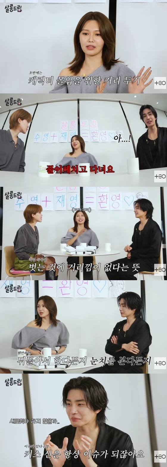 이날 최수영은 "두 사람이 많이 친해졌냐"는 질문에 "초반에는 거리를 뒀다. 처음에 캐릭터로 만나서 환상을 깨면 안 되니까 조심스러웠다. 하늘의 별처럼 두고 싶어서 안 친해지려고 거리두기를 했다. 제가 원래 현장에서 상대 배우와 장난도 많이 치고 아이디어도 많이 내는 편이라 거리두기를 하려고 했는데 오빠가 바지를 늘 잘 풀어 헤치고 다녔다"라고 밝혀 현장을 술렁이게 했다.