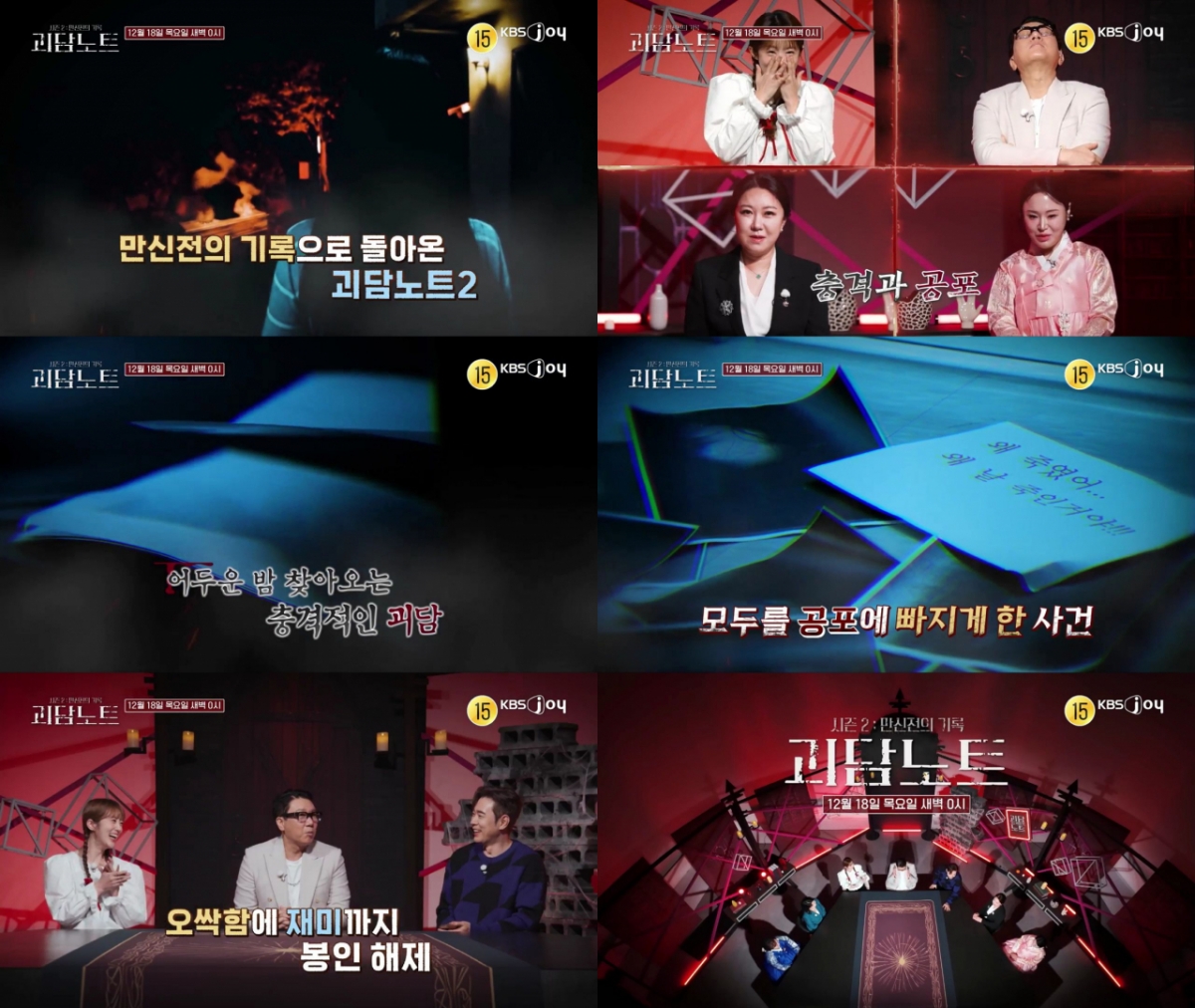 KBS Joy '괴담노트'는 보이지 않는 세계와 마주했던 이들의 실제 상담을 바탕으로 세상의 모든 금기된 이야기를 소개하는 리얼 오컬트 공포 예능. 지난 9월 이상민과 조충현, 하유비가 함께 매주 목요일 시청자들에게 오싹한 공포를 전해왔던 '괴담노트가' 시즌2로 돌아온다.