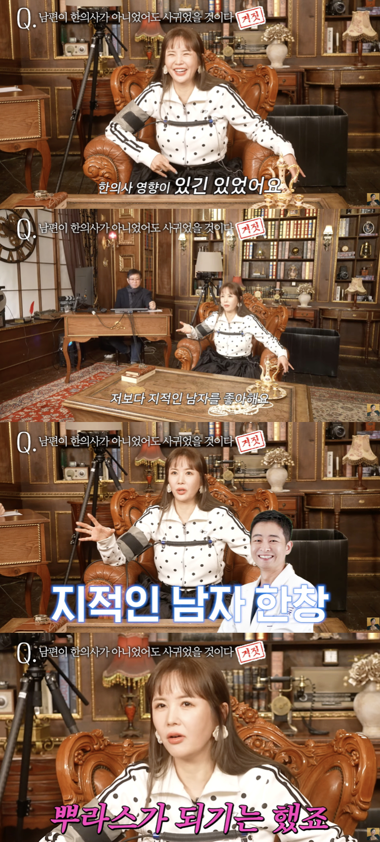 또한 그는 "남편이 한의사가 아니었다면 사귀지도 않았을 것"이라는 질문에 "아니오"라고 답했지만, 이 역시 거짓 판정을 받았다. 장영란은 이를 인정하며 "남편을 만난 게 한의사인 영향이 있었다"라고 털어놨다. 이어 "저는 저보다 지적인 남자를 좋아한다"라며 "한의사라서 좋은 게 아니라 지적이라서 좋았다. 한의사인 게 플러스 요인이긴 했다"라고 말했다.