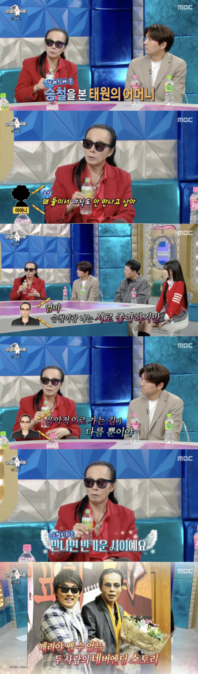 또한 김태원은 어머니의 반응도 전했다. 그는 "이승철을 본 우리 어머니가 '왜 둘이서 아직도 안 만나고 사냐'라고 하더라"라며, 이에 대해 "'엄마 승철이랑 나는 서로 좋아하는데 음악적으로 가는 길이 다를 뿐이야. 만나면 반가운 사이다'라고 했다"라고 말해 두 사람의 관계를 설명했다.