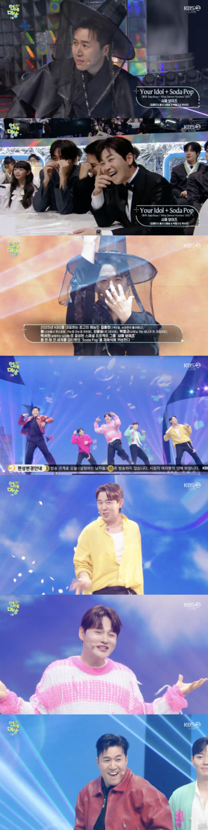 오프닝 무대의 주인공은 KBS 예능을 대표하는 얼굴들이었다. 김종민, 붐, 신윤승, 박철규, 박서진은 넷플릭스 영화 '케이팝 데몬 헌터스' 속 사자보이즈(Saja Boys)를 패러디한 '사짜 보이즈'로 등장해 시선을 단번에 사로잡았다.