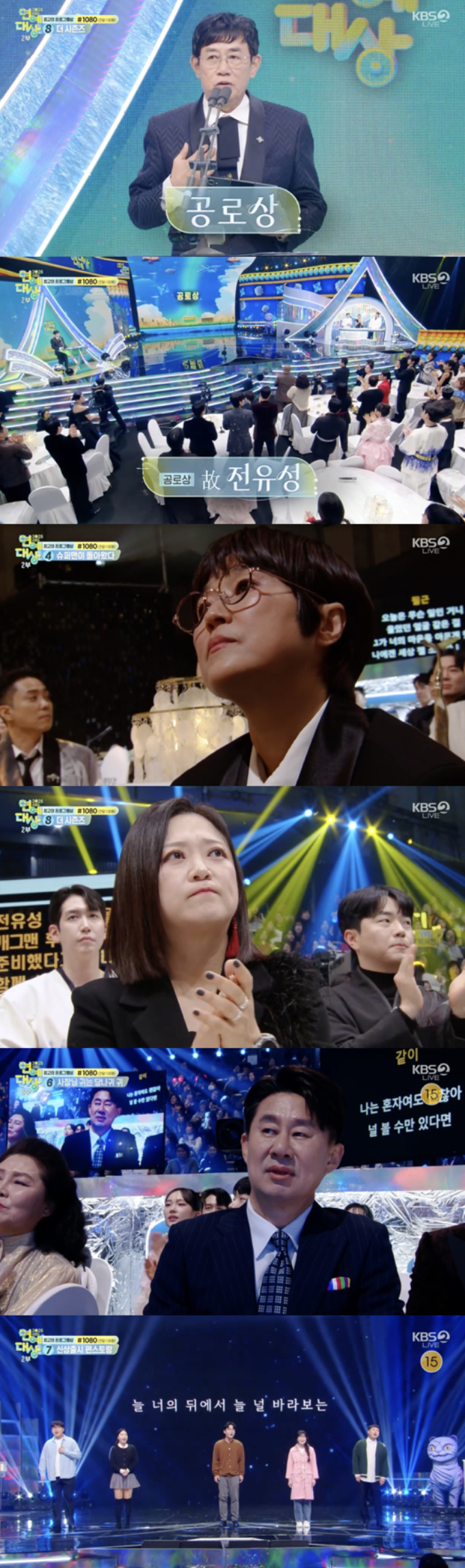 이날 공로상 시상자로 나선 개그맨 이경규는 "공로상을 발표하도록 하겠다. 저뿐만 아니고 우리 후배 개그맨들이 이렇게 열심히 활동하고 활약할 수 있는 기반과 토대를 마련해준 분이다. 이 분께 공로상을 바친다"라며 故 전유성의 이름을 호명했다.