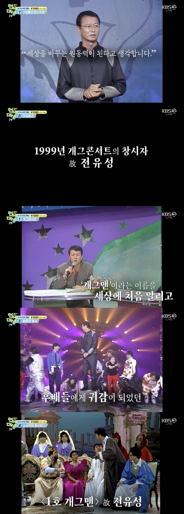 이어 '개그맨'이라는 명칭을 처음 만들어낸 전유성을 기리는 의미로 후배 개그맨들의 헌정 무대가 이어졌다. 개그콘서트의 인기 코너 '아는 노래' 팀은 '개그계의 큰 별' 전유성을 추억하며 특별 트리뷰트 무대를 준비했다.