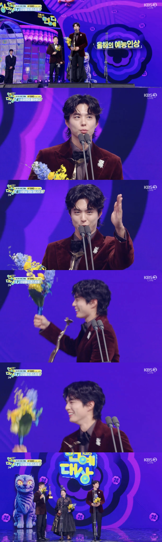 이날 시상식에서는 개그맨 김영희와 박보검, 김종민이 '올해의 예능인 상'을 공동 수상했다. 무대에 오른 박보검은 "어렸을 때부터 TV에서 봐왔던 좋아하는 선배님들을 다시 이 자리에서 뵐 수 있어서 영광이다"라며 소감을 시작했다.