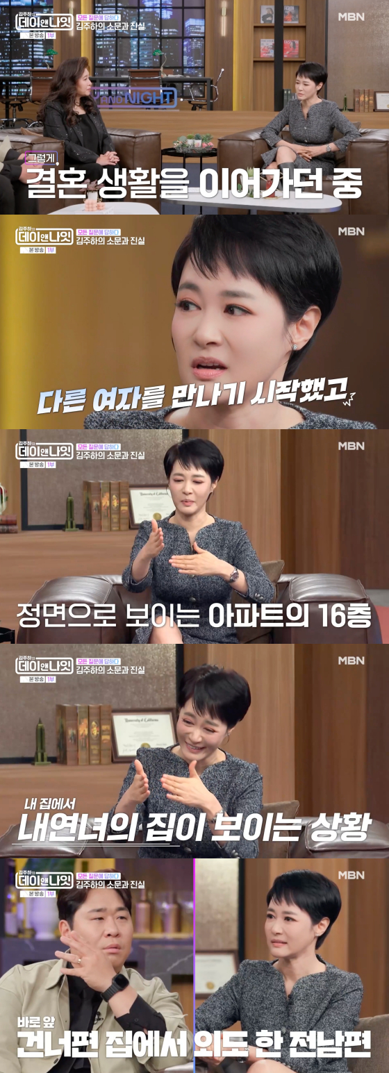 그러나 전 남편은 과거와 마찬가지로 외도를 일삼았다고. 김주하는 "그 사람이 다른 여자를 만나기 시작했다. 제가 전세가 끝나고 다시 이사를 갔는데, 저희 집이 나홀로 아파트 한 동 짜리였다. 외도녀는 정면으로 보이는 아파트 16층에 살았다. 두 사람이 뭘 하는지 다 보였다. (뭘 하는지 본 적도) 있다"고 말해 또 한번 충격을 자아냈다.
