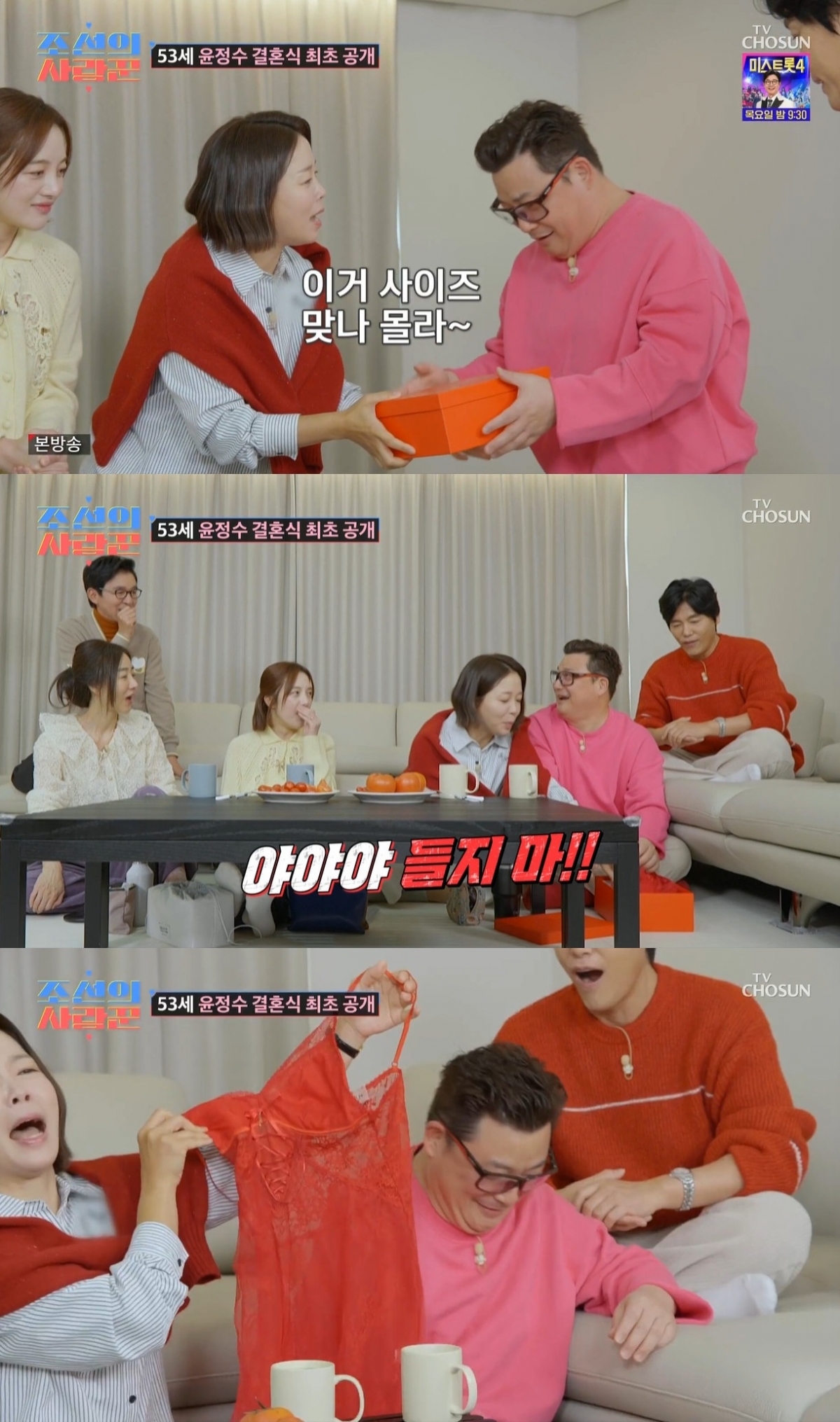 정이랑이 선물한 건 붉은 신스루 속옷이다. 윤정수는 "양파망 같이 생겼다"라고 하자, 정이랑은 "신혼여행 때 찢어버리는 거다"라고 말해 웃음을 자아냈다.