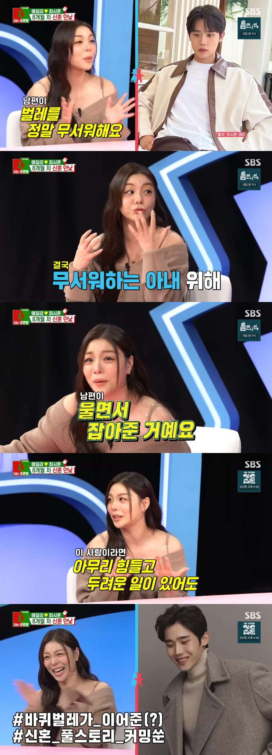 에일리는 "남편이 벌레를 되게 싫어한다. 눈물을 흘리면서 도망갈 정도다. 나도 그만큼 벌레를 싫어한다. 어느 날 집에 있는데 바퀴벌레가 밖에서 들어온 거다. 소리를 지르면서 둘이 난리가 났다. 울면서 '잡아줘' 했는데 남편도 나한테 '잡아줘' 하는 거다. 내가 극도로 무서워하니까 남편이 울면서 잡아줬다. 그걸 보고 잡아준 것도 잡아준 건데, 이 사람이라면 아무리 힘들고 두려운 일이 있더라도.."라며 벌레를 잡아준 남편의 용기를 극찬했다.