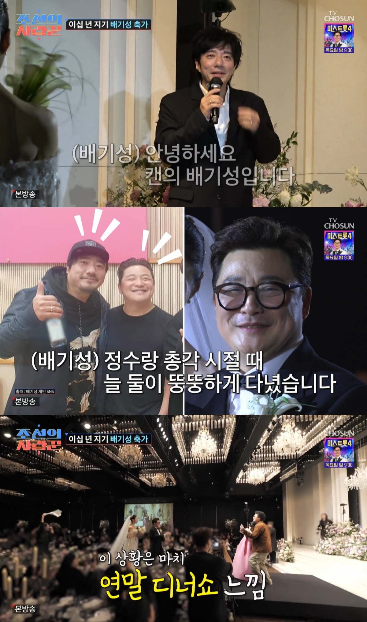 두 번째 축가는 배기성이 무대에 올랐다. 그는 이전과 다르게 다이어트에 성공한 모습이었다. 이에 "진심으로 결혼 축하한다. 정수랑 총각시절 늘 둘이 뚱뚱하게 다녔다. 그때 결혼할 수 있을까 생각했다. 그리고 쟤는 언제 정신차리나 했다. 정말 짝에 맞는 사람을 찾아서 결혼했다. 서로 봄날이라는 느낌으로 내 아내에게 불렀던 '오늘의 봄날'을 정수 대신 부르겠다"라고 축하했다.