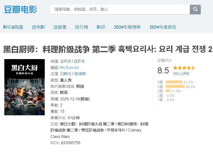 23일 성신여대 창의융합학부 서경덕 교수팀에 따르면 중국 최대 리뷰 사이트 더우반에는 '흑백요리사2'에 관한 리뷰 페이지가 이미 만들어졌고, 이날 오전 기준으로 리뷰가 70여 건, 별점 평가에는 370여 명이 참여했다.