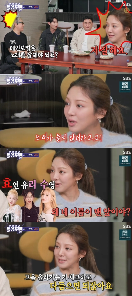 효연은 "수영이가 '왜 네가 태연 자리냐'라고 따지면서 자기도 보컬 트레이닝을 받고 있다고 뒤로 가라고 하길래 읽씹했다"라고 전해 웃음을 안겼다. 그는 또 "예전에는 이미지 관리 때문에 못 하는 게 많았다면 지금은 못 할 게 없다고 생각한다. 고음 올라가는 거 체크하고 다듬으면 되지 않냐"라고 당당한 모습을 보였다.