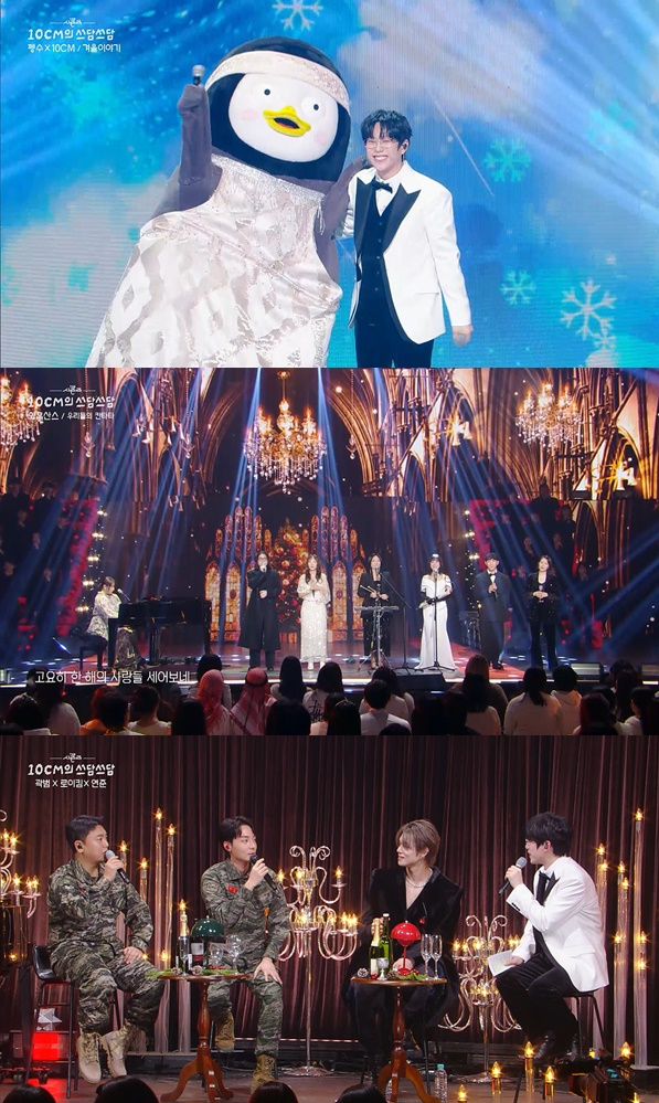 지난 26일 방송된 KBS 2TV 뮤직 토크쇼 '더 시즌즈-10CM의 쓰담쓰담'에는 요조, 옥상달빛, 강아솔, 장들레, 썬더릴리, 루카 마이너, 펭수, 임시완, 노건(박성웅), 소수빈, 정승환, 김영옥, 투모로우바이투게더 연준, 로이킴, 곽범이 출연해 특별한 연말 무대를 선보였다.