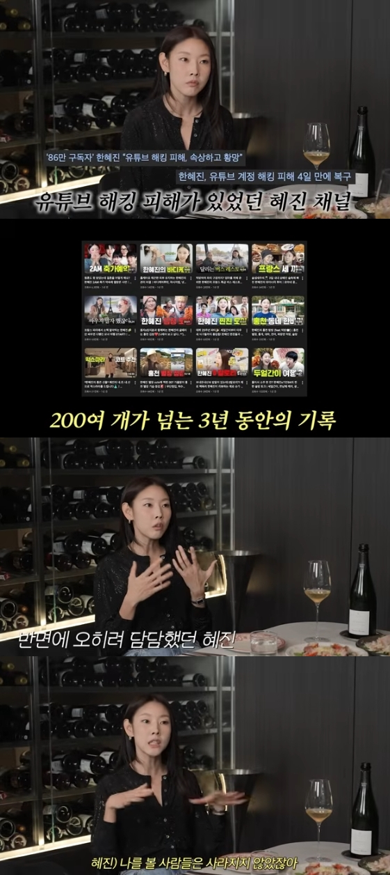 한편 한혜진은 지난달 10일 발생한 해킹 피해로 채널 운영에 제약을 받았으나 4일 만에 복구해 86만 구독자와 재회했다.