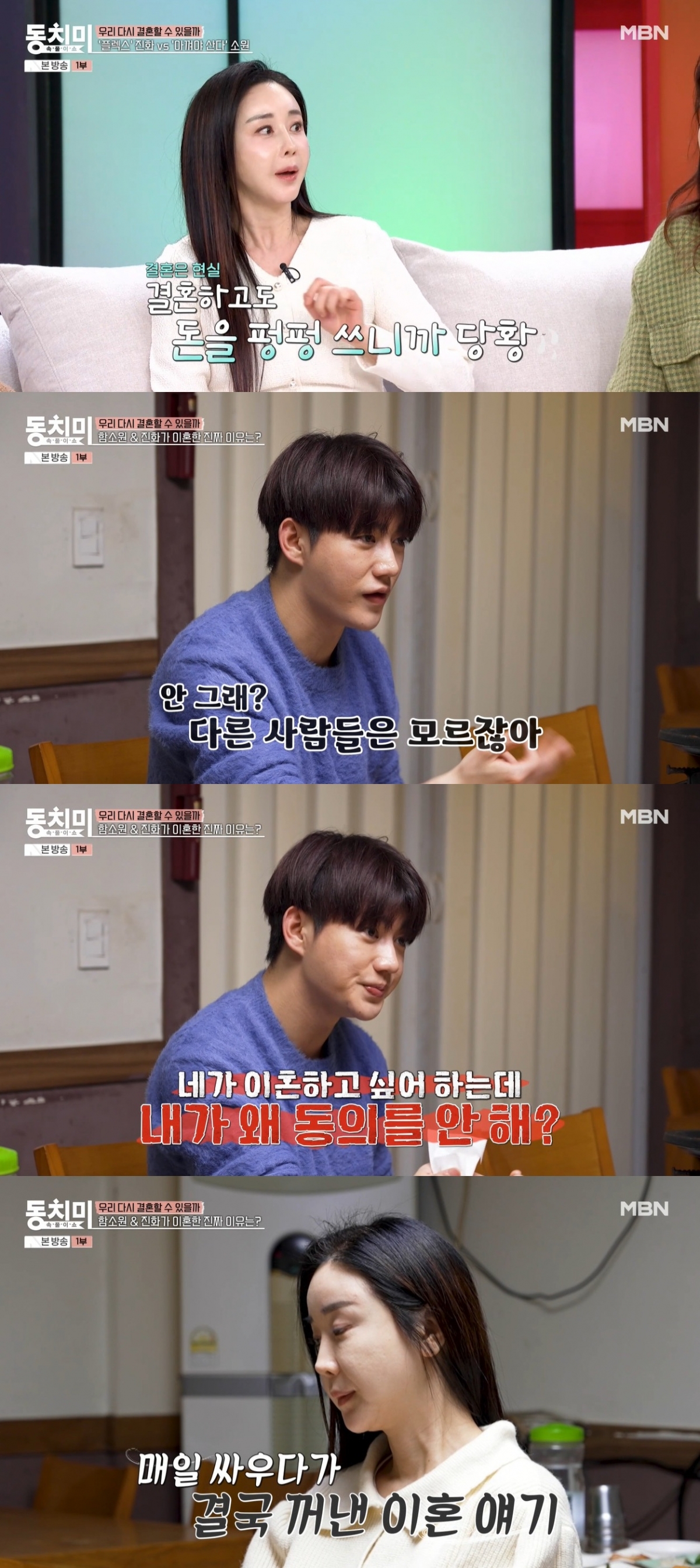 이에 진화는 "네가 이혼하고 싶어 하는데 내가 왜 동의 안 하냐. 당연히 네가 하자는 대로 한다. 맨날 싸우고 매일 짜증 나는데 이혼해야지 어떡하냐"라고 했다. 함소원은 "전부 내 탓만 한다"라고 말하자, 진화는 "그때 나도 문제가 있었던 건 맞다. 난 어렸고 코로나19라 힘들지 않았나. 그래서 우린 다툼이 많았고 자주 싸웠다. 그때 정말 힘들었다. 그래서 우리가 이혼한 거다. 다른 방법이 없으니까. 다시 그때로 돌아가도 우리는 또 이혼했을 거다"라고 단언했다.
