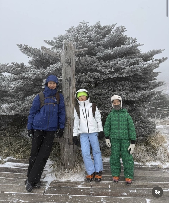 공개된 사진 속 김나영은 윗세오름이라고 적힌 나무 기둥 옆에서 아들 신우, 이준 군과 함께 포즈를 취하고 있다. 눈보라가 치는 혹한의 추위에 세 사람은 모자에 장갑, 패딩까지 완전 무장을 한 채 한라산 등반에 나섰다.