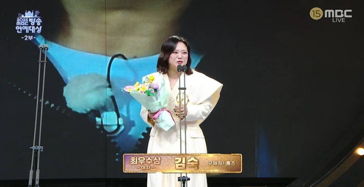 특히 김숙은 여자 최우수상을 받았다. 그는 "오늘은 정말 손뼉 치려고 했다. 오늘 아침에 올까 말까 정말 고민했는데 안 오면 어쩔 뻔했나. 이렇게 좋은 상을 줬는데"라며 "올해 30주년이다. 스무살 때 방송국 들어와 50세가 됐다. 나 혼자 자축하려고 했는데 많은 분이 축하해줘서 감사하다"라고 인사했다. 이어 "'구해줘 홈즈'를 7년 했다. 다들 너무 감사하다. 그분들 때문에 상을 받은 거 같다. 우리 식구들 장동민 코디, (양) 세형이, (양) 세찬이 그리고 (주)우재, (김) 대호, (박) 나래 팀장님까지 감사하다. 그분들 때문에 상을 받았다"라며 "이 상을 받은 의미로 섬 임장 가겠다. 주우재와 함께 가겠다. 주우재가 섬을 좋아한다. 꼭 떠나도록 하겠다. 30년간 관둔다고 했는데 끝까지 잡아준 유재석, 송은이, 이영자 언니에게 감사 인사를 드리겠다"라고 덧붙였다.