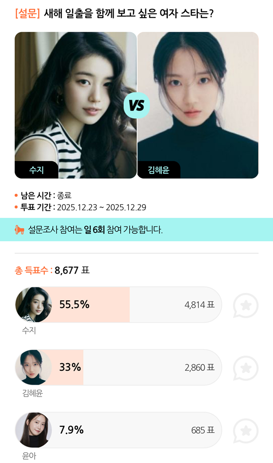 수지는 지난 23일부터 29일까지 종합 엔터테인먼트 모바일 앱 스타폴(STARPOLL)에서 진행된 '새해 일출을 함께 보고 싶은 여자 스타는?' 설문에서 1위에 올랐다.